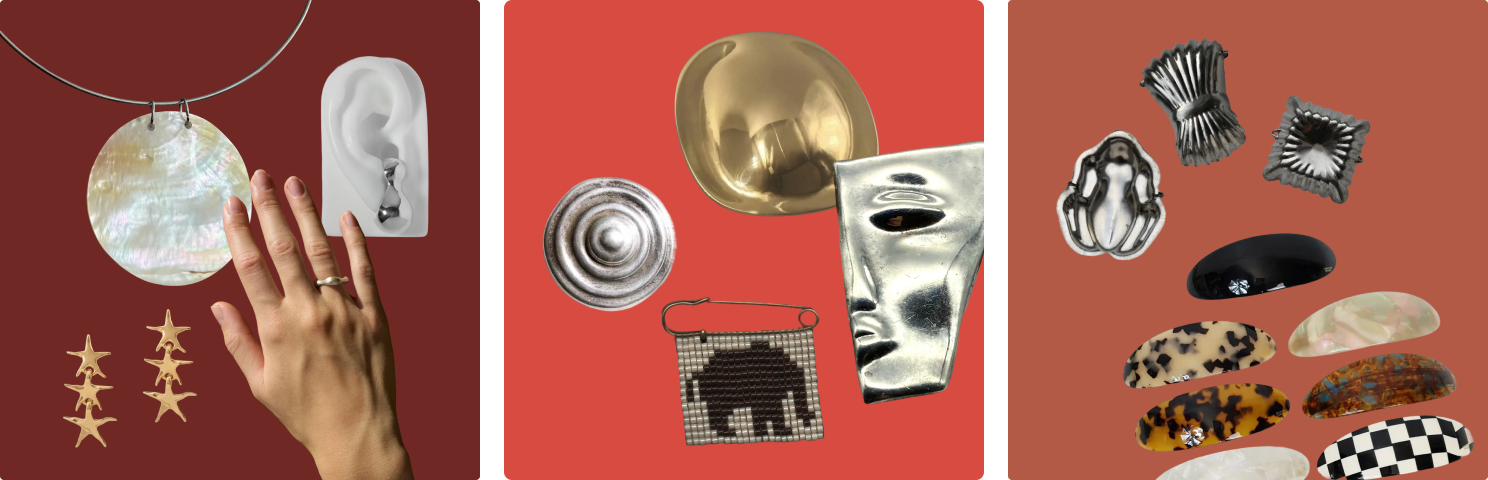 Taxco modernist brooch / Chunky bullseye brooch / Vintage Taxco half face brooch / Metal hand brooch / Silk chrysanthemum brooch / Stainless steel minimalist brooch / Brutalist sunburst brooch / Venerable Beads creature beads XIV